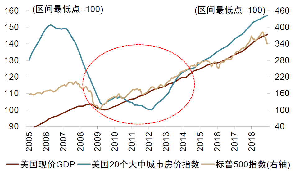 简而言之,美国金融周期下行阶段的“水牛”可以总结如下。伴随金融周期下行,私人资产负债表快速恶化,但由于美国政府快速而大力松货币加上宽财政,政府杠杆率上升,私人宏观杠杆率下降,资产负债表改善。虽然当时经济还未改善,楼市还未见底,但资产负债表改善导致私人资产配置出现变化。
