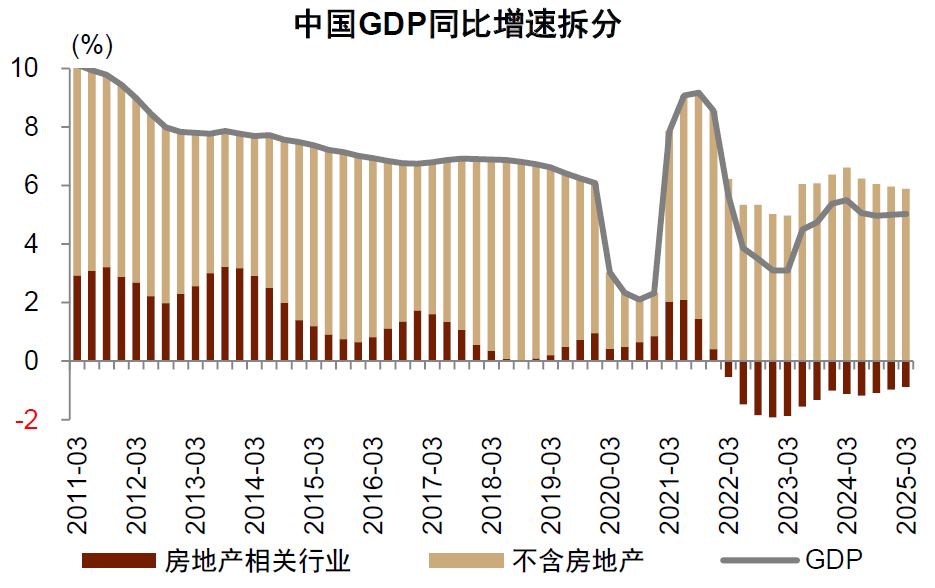 注:房地产相关行业占实际GDP比重的分子是当季房地产业实际GDP和房地产开发投资实际值的和,分母是当季实际GDP;房地产业实际GDP由统计局公布,房地产开发投资的实际值由房地产开发名义投资与PPI推算而成;剩余部分为不含房地产的GDP