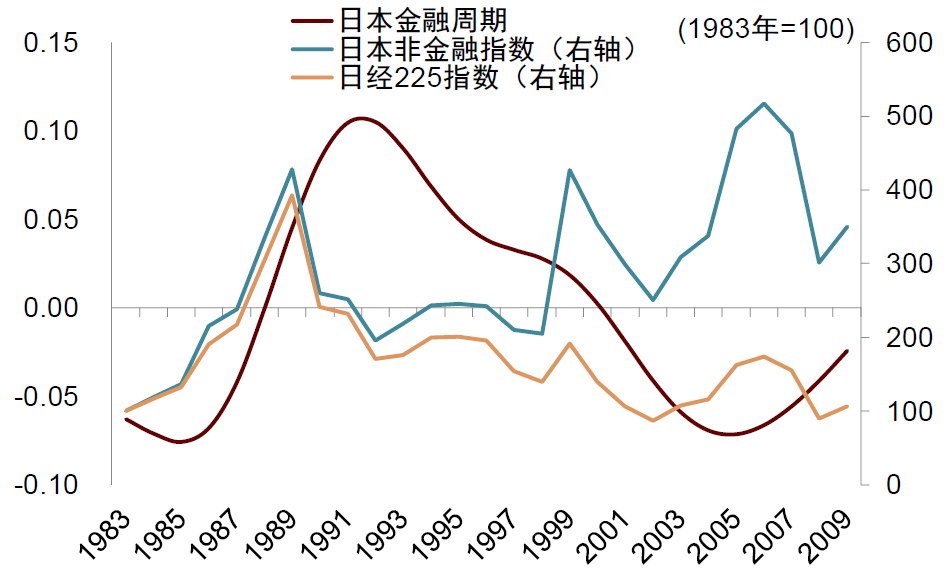 图表10:日本金融周期下行阶段,经济和股市表现弱