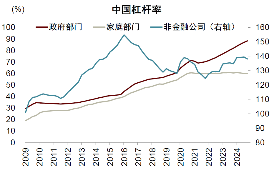 金融周期下行以来,我国居民部门宏观杠杆率停止上行,但尚未出现明显下降,非金融企业宏观杠杆率出现波动。与此对应,政府部门宏观杠杆率有所上升,但比较克制,从2022年的71%上升到2024年的88%(图表19)。