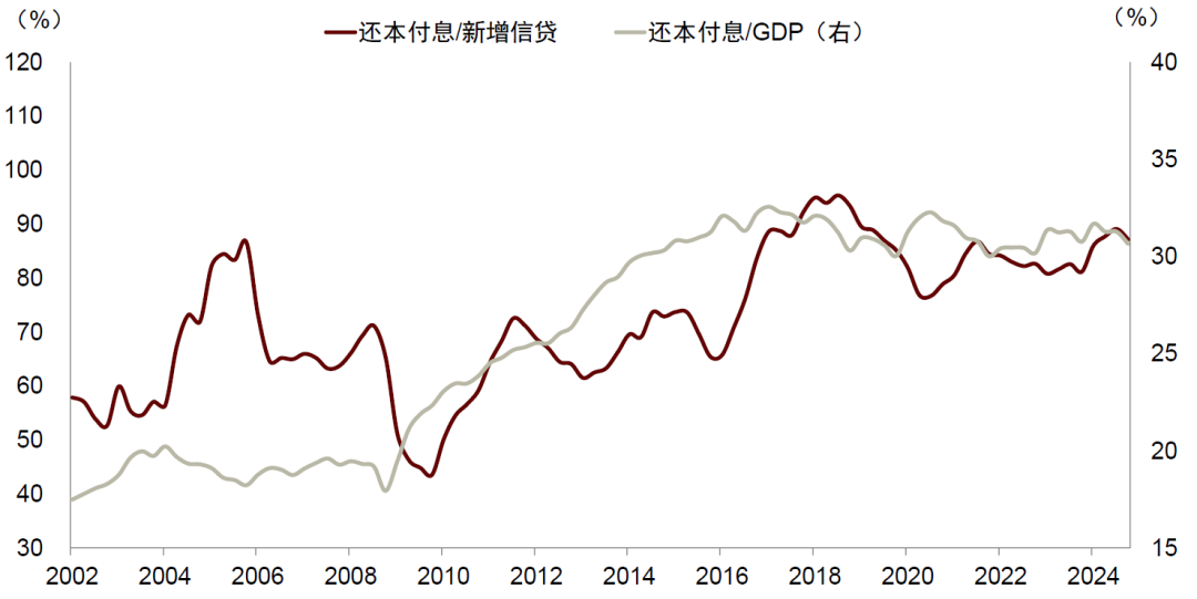 展望未来,从宏观层面如何推衍股市呢?借鉴国际经验,金融周期下半场的股市上涨与宏观政策力度,尤其是财政的宽度相关性较高。因为金融周期调整带来的一个核心问题是债务,政府加杠杆,央行扩表有利于改善私人资产负债表,这个方面中国仍然有较大空间。2021年以来,我国非金融私人部门还本付息占GDP的比例,以及还本付息占新增信贷的比例整体持平,尚未出现明显下降(图表25)。