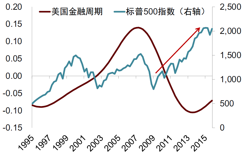 美国在次贷危机爆发后,股市快速下行,但一段时间之后股市先于经济基本面和房价反弹,在2009年后出现一轮持续较长的上涨。美国在2007年爆发次贷危机后,20个大中城市房地产价格下跌到2012年一季度才触底反弹。美国的名义GDP到2009年二季度到达阶段性低点。但是,如果看标普500指数,在2009年一季度已经开始触底反弹,领先实体一个季度,领先房价三年(图表4)。从金融周期来看,美国从2007年到2013年都处于金融周期下行阶段,但是标普500指数从2009年低点到2013年实现了翻倍(图表5)。