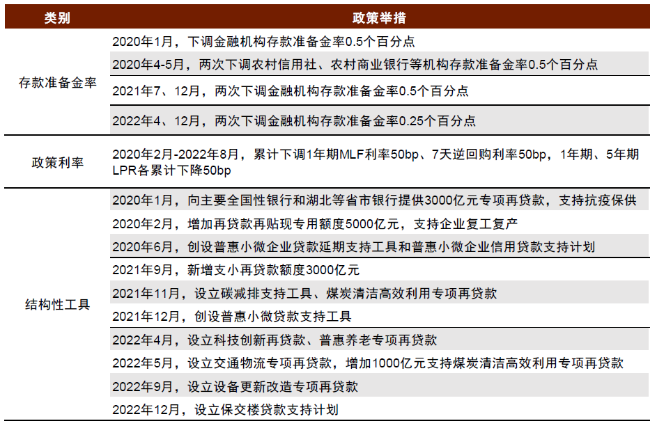 央行扩表空间较大。从海外央行的经验来看,在经济和金融遭受较大压力的时候,如2008年金融危机发生后,海外央行扩大可接受的抵押品范围,调整基础货币的投放方式,主动承担一部分风险,通过资产负债表扩张降低风险溢价。我国央行资产扩张的空间相对较大(图表26)。在 2020-2022 年这三年时间里,央行一方面调降存款准备金率200bp以上,下调MLF利率、7天逆回购利率各50bp,另一方面积极通过多种结构性工具将信贷资源更有效地传导到经济中的关键部门和薄弱环节,如创设普惠小微企业贷款支持工具支持受疫情冲击较严重的小微企业,创立科技创新再贷款和普惠养老专项再贷款支持经济结构转型,设立保交楼贷款支持计划促进房地产市场信心恢复等(图表27)。2024 年 9 月,央行又创设证券、基金、保险公司互换便利和股票回购、增持专项再贷款两类再贷款工具为股票市场提供流动性支持。