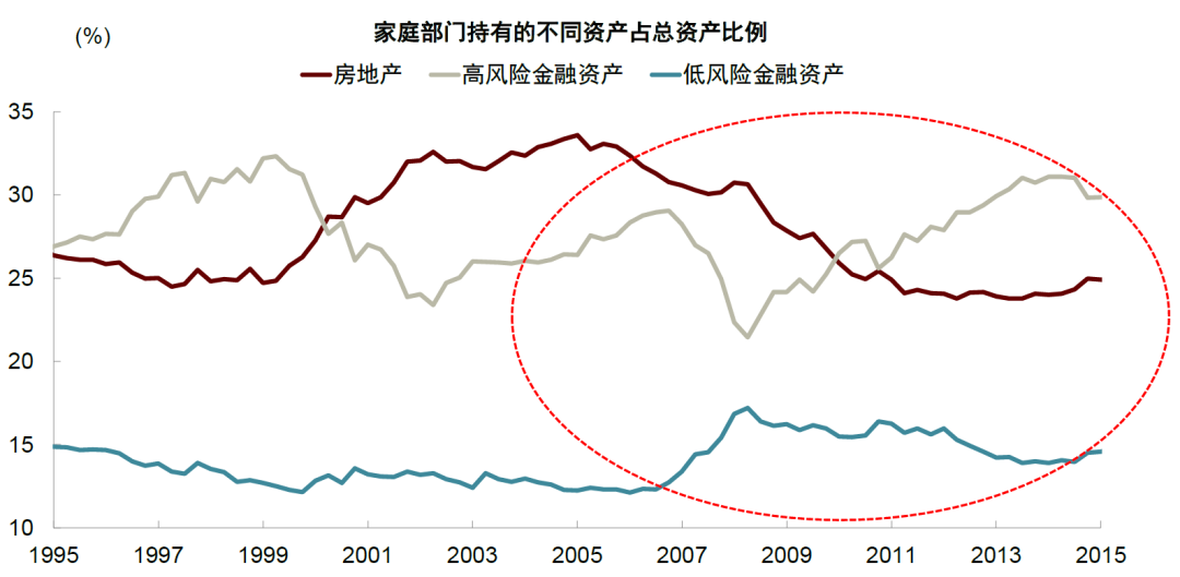 金融周期下行的最初几年日本政府部门的宏观杠杆率不升反降,90年代末才开始上升,与此相应,日本家庭部门宏观杠杆率在金融周期见顶后停止上行,但没有出现下降。而同期非金融企业宏观杠杆率先是继续上升,90年代末随着政府加杠杆后才开始下降(图表12)。这种情况下,日本私人部门并没有像美国那样快速增配风险资产,推升股市。1994 年到 2005年期间,日本居民部门的资产配置中,房地产占比从 41.3% 下降到27.0%,高风险的金融资产占比从 5.7% 上升到9.1%,低风险的金融资产占比从 38.5% 上升到48.9%(图表13)。
