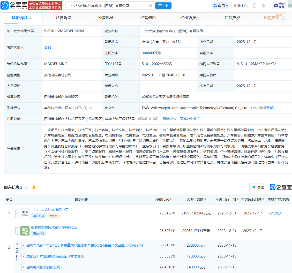 近日,一汽大众捷达汽车科技(四川)有限公司成立股票配资在线公司,法定代表人为聂强,注册资本为30亿元,经营范围包含:汽车零部件及配件制造;汽车零部件研发;汽车零部件再制造;汽车装饰用品制造;汽车轮毂制造等。企查查股权穿透显示,该公司由一汽—大众汽车有限公司、成都捷龙重振汽车科技有限公司共同持股,其中,成都捷龙重振汽车科技有限公司由国有背景产业基金共同持股。据悉,今年8月,成都经开区管委会、中国一汽集团、大众汽车集团(中国)正式签署《捷达事业发展合作协议》,宣布将在一汽-大众成都生产基地的布局基础上,通过引入本地投资,成立捷达品牌新公司。